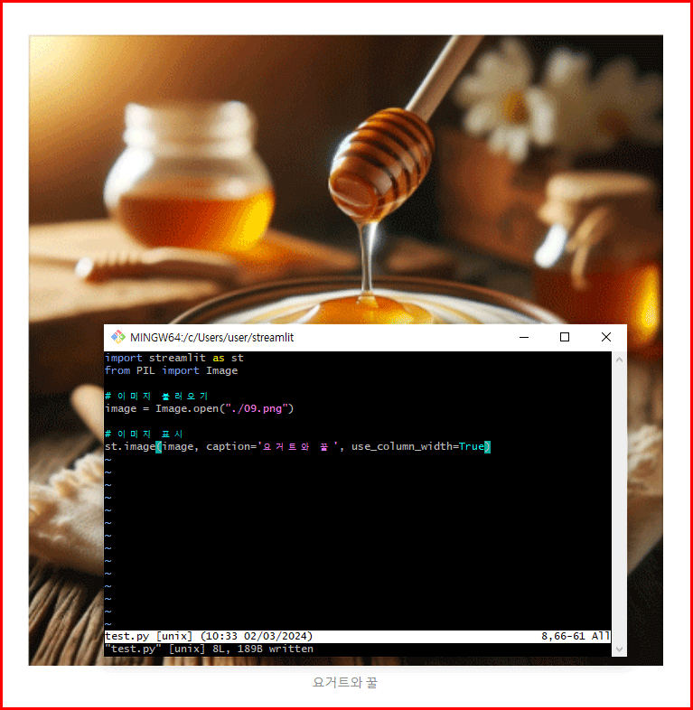 Image.open("경로/이미지파일명"):PIL라이브러리의Image모듈을 사용하여 이미지 파일을 불러옵니다. 여기서"경로/이미지파일명"에는 표시하고자 하는 이미지 파일의 경로와 이름을 지정합니다.st.image(image, caption='이미지 설명', use_column_width=True): 스트림릿의image함수를 사용하여 이미지를 표시합니다.image파라미터에는 불러온 이미지 객체를,caption에는 이미지 아래에 표시될 설명 텍스트를,use_column_width=True옵션을 통해 이미지가 스트림릿 앱의 칼럼 너비에 맞게 조정되도록 할 수 있습니다.