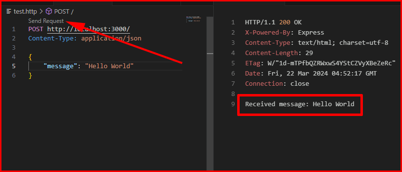 POST http://localhost:3000/ Content-Type: application/json { "message": "Hello World" }