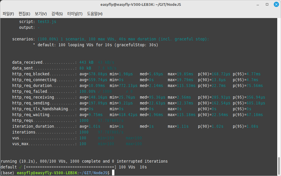 - http_req_duration: 평균 요청 처리 시간 10.09ms.