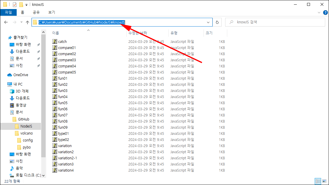 탐색창을 이용하여 해당 폴더로 이동합니다. 주소창의 경로는 ' Breadcrumbs' 형식으로 표시됩니다. 이 방식은 현재 사용자가 있는 디렉터리의 계층 구조를 시각적으로 보여주고, 각 부분을 클릭하여 빠르게 상위 폴더로 이동할 수 있게 해 줍니다. '내 PC > 문서 > GitHub > NodeJS > knowJS'라는 경로가 이 방식으로 표현된 것입니다. 사용자는 이 경로의 각 부분을 클릭하여 해당 폴더로 즉시 이동할 수 있습니다.