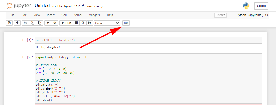 - Shift + Enter: 셀 실행 후 다음 셀로 이동 (새 셀 생성)