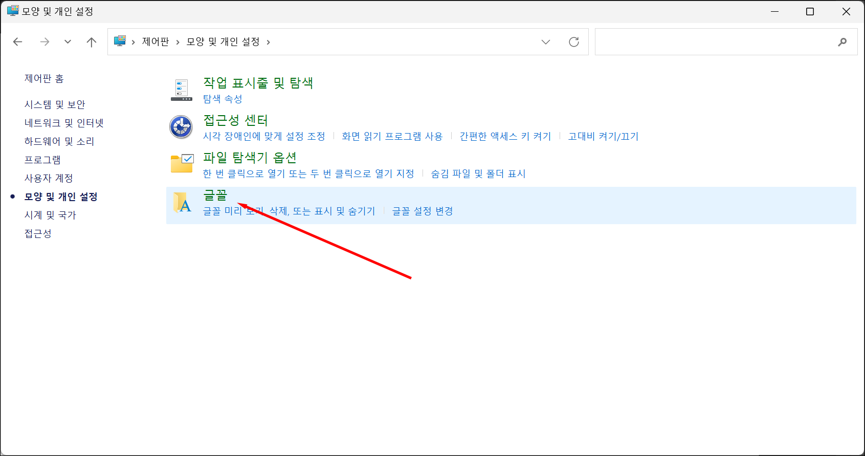 제어판>모양 및 개인 설정>글꼴을 클릭합니다.- 설치된 폰트 목록이 나타납니다.