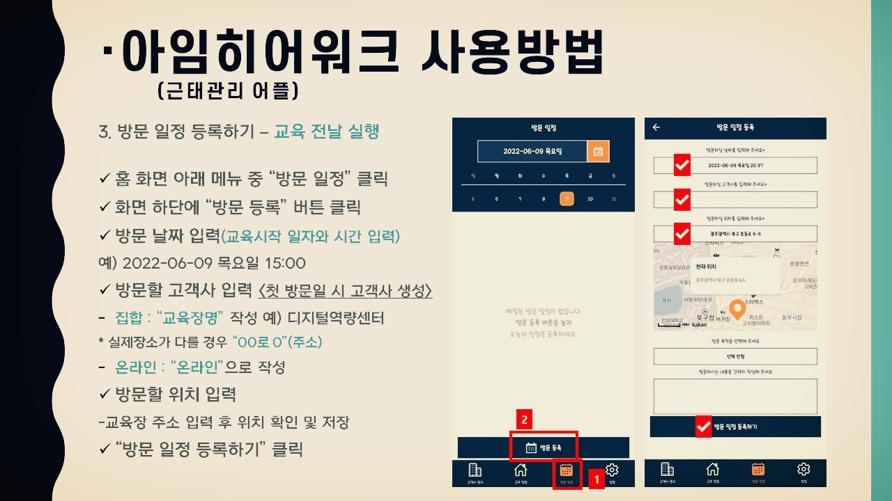 방문 일정을 등록합니다. 날짜와 시간, 그리고 장소 등을 틀리지 않도록 합니다. 방문 일정은 미리 등록하는 것이 좋습니다. 안된 경우 시간 전에 등록해 사용해도 됩니다.