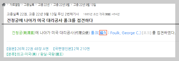고종 22년 9월 13일은 서기 1885년 9월 13일입니다. 미국 공사 푸트가 사임하고 포크가 대리공사를 맡으면서 고종을 만나 인사를 하는 자리일 것입니다.