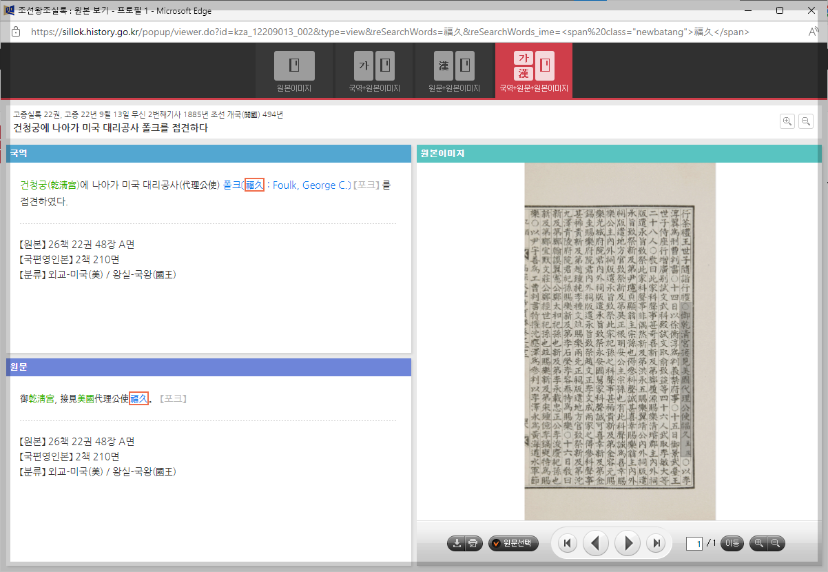 조선왕조실록 홈페이지에서 고종 대를 선택하고 검색을 요청했습니다. '복구'로 검색한 결과는 많았기 때문에 한자어로 검색했습니다. '조지 포크'를 조선왕조실록에는 '복구(福久)로 기록했거든요.