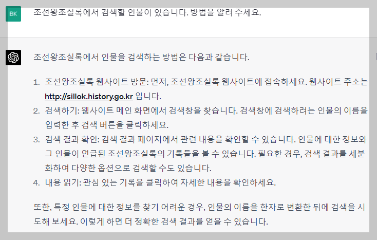 챗봇에게 물었습니다. '조선왕조실록에서 검색할 인물이 있습니다. 방법을 알려 주세요.'라고. 답을 주네요. '사이트'에 접속해서 물어보라고.