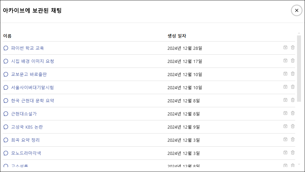 설정 메뉴는 다양한 환경 설정과 삭제 등의 작업을 할 수 있습니다. 그중 하나가 '아카이브에 보관된 채팅' 관리가 있습니다. 보관된 대화를 불러내서 계속 채팅을 이어갈 수 있다는 얘기입니다. '관리'를 클릭합니다.