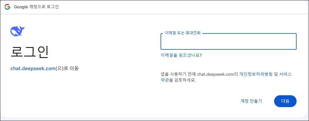 DeepSeek 사용 방법은 간단합니다. 'chat.deepseek.com'으로 연결하고 회원 가입을 합니다. 제 경우는 구글 지메일을 이용했습니다.