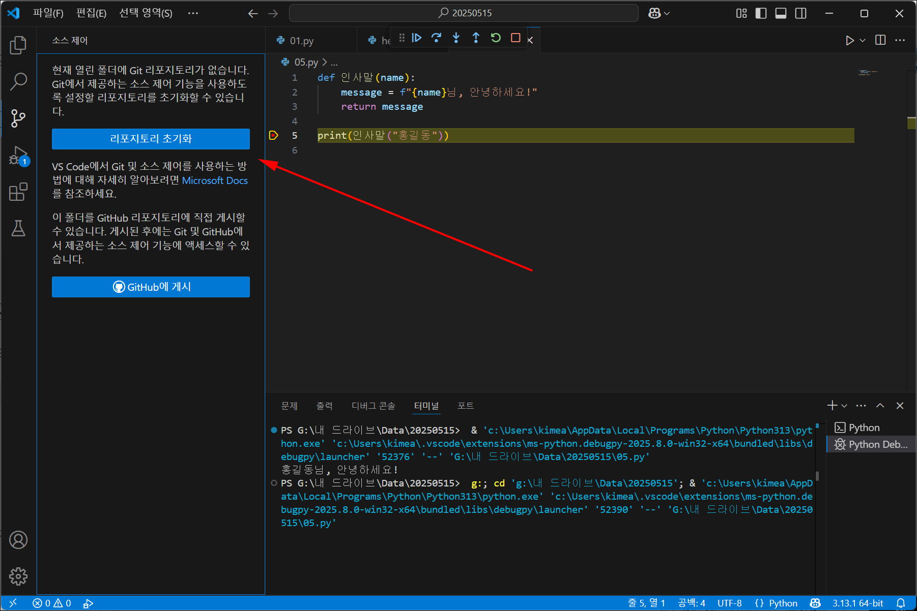 🟦 6단계: VSCode에서 Git 연동하기