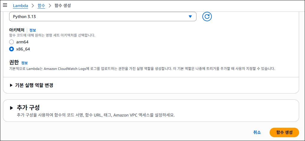 - 런타임: Python 3.13 또는 Node.js 선택 가능