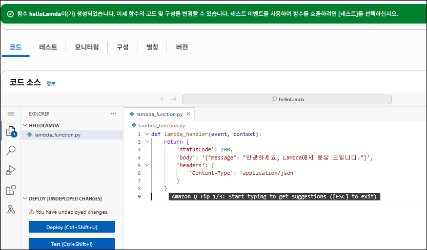 | Lambda 생성 | 함수 코드 작성 및 배포 |