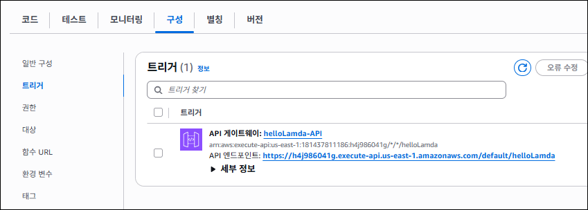 - 추가 → 자동으로 API가 생성되고 Lambda와 연결됩니다