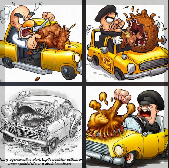 네 번째 프롬프트: '모범택시를 운전하는 모자 쓴 기사님이 손으로 튀긴 통닭을 뜯고 있는 모습, 카툰'