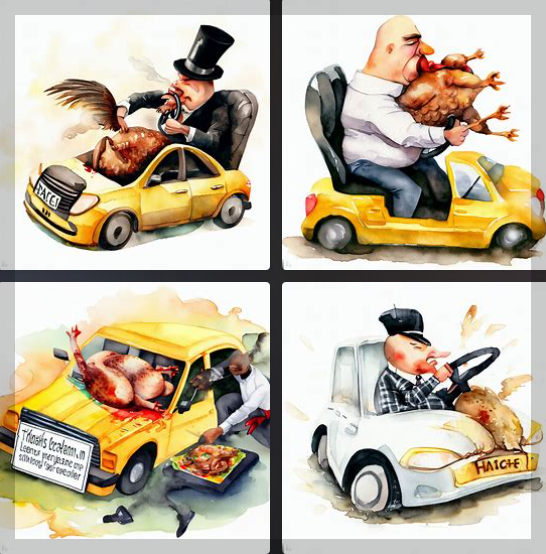 세 번째 프롬프트: '모번택시를 운전하는 모자 쓴 기사님이 손으로 통닭을 뜯고 있는 모습, 수채화'